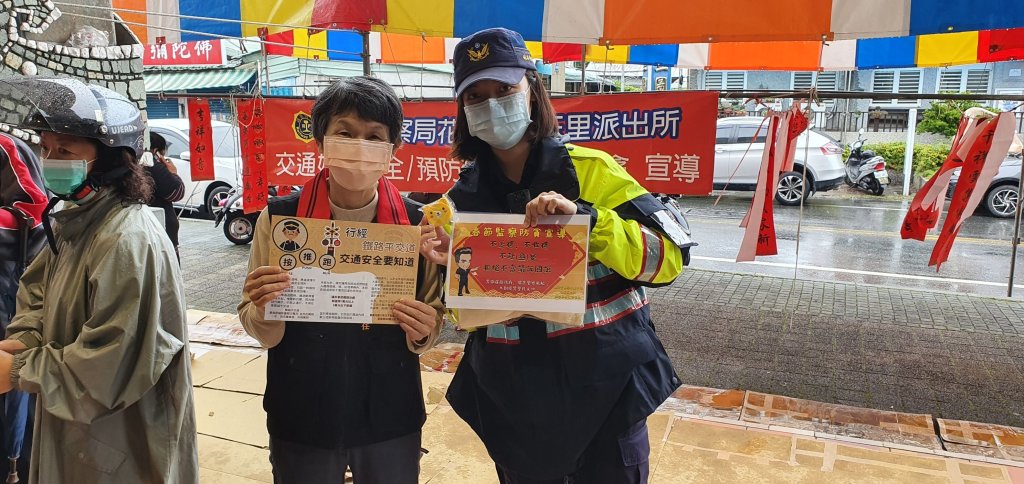 警員陳姵君也向在場民眾叮嚀,春節連續假期間前往公務及警政機關拜訪或洽公一定要秉持不送禮、不收禮、不(赴)邀宴、拒絕不當請託關說立場,協助端正警察風紀、響應政府廉能政策,建立警察廉潔優良形象。另外在交通部分若有外出或是走春行程,都要謹記乘坐大眾運輸務必要遵守防疫措施落實實聯制、全程配戴口罩且乘車期間車廂內全面禁止飲食等各項防疫規定;自行駕車亦應遵守各項交通安全規則,避免疲勞駕駛、絕對禁止酒後駕車,能夠健康平安返家團聚過年最重要。