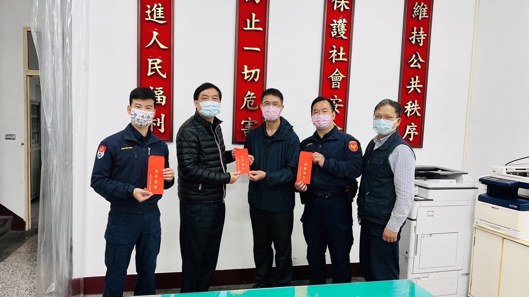 1月28日上午10時,花蓮港務警察總隊長張維鎮、督察長邱秋煌、秘書室主任陳文宗等人,陪同花蓮港警察之友會主任委員林慶明至各內、外勤單位實施慰問,並頒發春節工作獎勵金、季節水果和乾果食品與同仁分享,同時籲請民眾響應政府廉能政令,支持花蓮港務警察總隊落實「不送禮、不受禮、不赴(邀)宴、拒受請託關說」規定,共同攜手打造廉能政府。並提醒警察同仁及民眾落實防疫手則,於公眾場合配戴口罩、保持社交距離,保護自己及他人健康,過個治安平穩、交通順暢、民眾安心的春節假期。