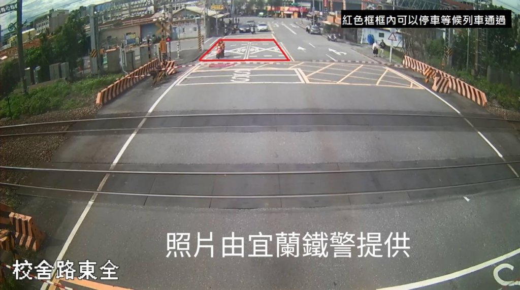 鐵路警察局花蓮分局宜蘭派出所表示,同仁在監看校舍路平交道監視器時,常常發現大家不敢在「近鐵路平交道線」上停車等候列車通過,也就是照片中紅色框框的範圍。