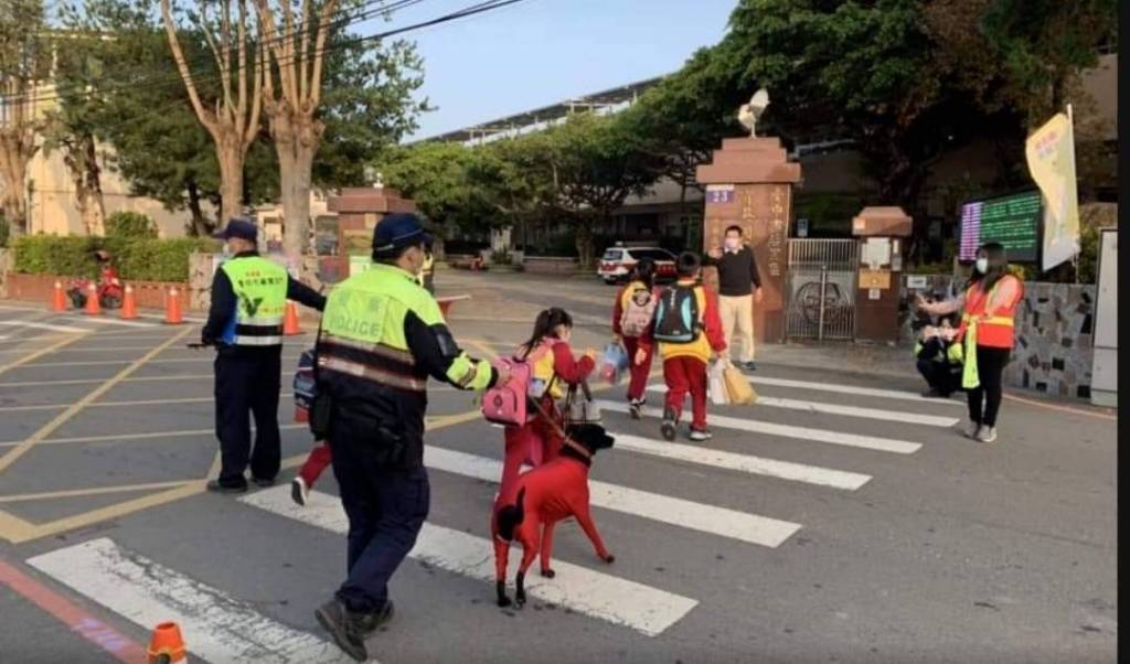 昨11日是開學首日,台中市政府警察局大甲警分局全力啟動「護童勤務」,動員62名警力於上、下學時段積極守護學童安全、提供學童、家長即時且溫馨協助外,並與學校師長、導護人員保持密集聯繫,以確保學童上、下學安全,有趣的是,月眉所警犬花花,也參與此次任務,穿上一身紅色除了添加喜氣之外,也代表著警戒、停止意識,當看到導護志工的「停」,請務必禮讓學生先行。