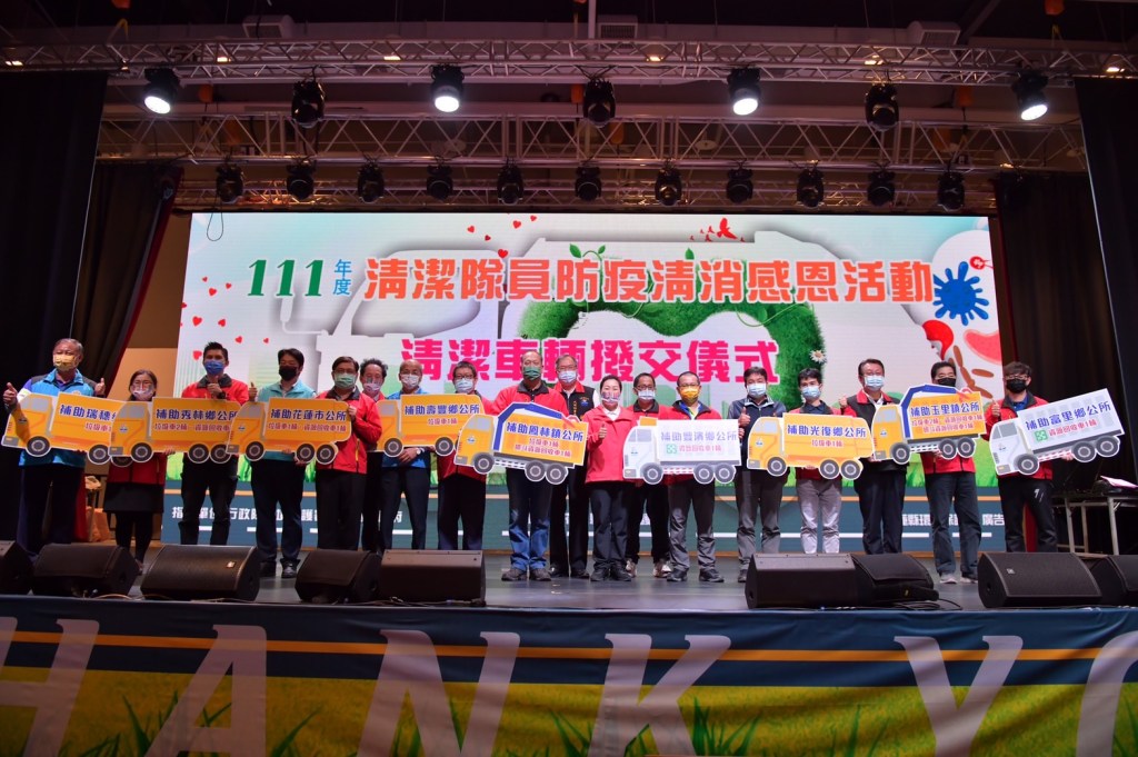 為感謝清潔隊員平日為環境清潔付出的辛勞,環保局今(16)日於新天堂樂園舉行「111年度清潔隊員防疫清消感恩活動暨清潔車輛撥交儀式」,縣長徐榛蔚親臨主持並偕秘書長饒忠、環保局副局長饒慶龍及環保局同仁,親自將象徵車輛移交的樣式版交給13鄉鎮市公所清潔隊,現場另有各種環保車輛展示,場面溫馨熱鬧。