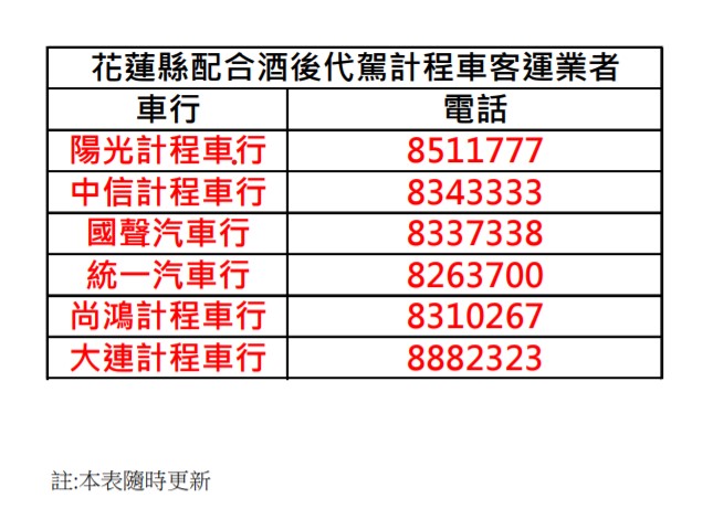 目前花蓮縣計有6家配合酒後代駕計程車客運業者(陽光、中信、國聲、統一、尚鴻、大連),花蓮縣警察局已利用各種勤務、公眾集會,網路社群媒體加強宣導「代客駕車」服務,並主動至轄內餐廳、小吃店,宣導「喝酒勿開車」、「指定駕駛」、「代客叫計程車」,請業者主動關心飲酒民眾,並協助提供安全返家建議,共同防制酒駕事故。