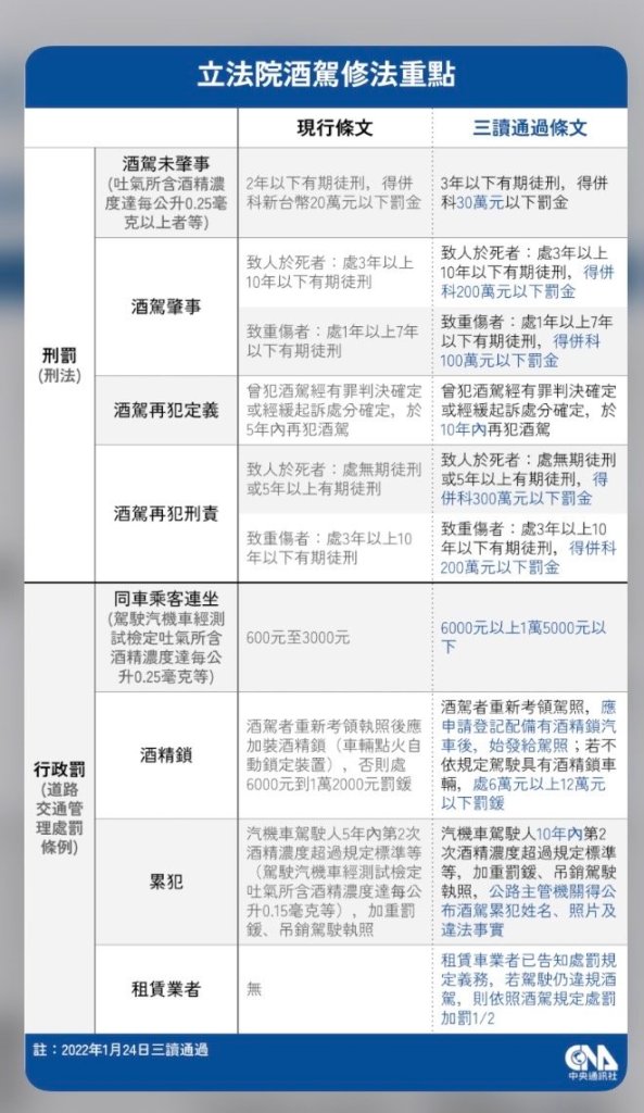 立法院於(1)月24日三讀修正通過酒駕新制,並於同月28日由總統府公布施行,將酒駕未肇事的刑責從原本2年以下有期徒刑,提高為3年以下有期徒刑,並明定公路主管機關得公布10年內第2次酒駕累犯者姓名、照片及違法事實,另加重同行者連坐處分最高新台幣1.5萬元罰鍰(交通部表示累犯紀錄追溯自108年7月1日開始)。本案鄭男於108年間已有2次酒駕紀錄,駕照經註銷,此次為第3次酒駕,符合酒駕新制累犯要件,將加重處罰。