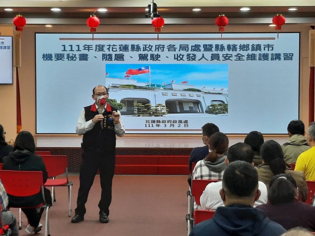 近來全臺各縣市行政首長之維安風險事件時有所聞,為有效加強機關首長人身安全維護措施,並提昇花蓮縣政府及各鄉鎮市機要秘書、隨扈、駕駛及收發人員安全維護知能,花蓮縣政府政風處今(2)日於縣府大禮堂舉辦「111年度花蓮縣政府各局處暨縣轄鄉鎮市機要秘書、隨扈、駕駛、收發人員安全維護講習」,希冀能增進與會人員之廉政素養,強化廉政相關法令及安全維護等專業知能;此次參與講習人員共計近百人,出席情況十分踴躍。