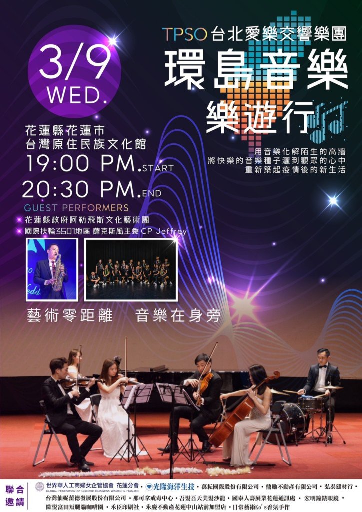 受到音樂人的感動,「世界華人工商婦女企管協會花蓮分會」在總會號召下與花蓮縣政府原住民行政處合作辦理《環島音樂樂遊行》演出活動,分享音樂沒有分別、沒有距離、沒有限制的,只要願意隨手都是音樂,此次演出也特別邀請國際扶輪社3501地區的薩克斯風主委CP Jeffrey以音樂會友,以音樂交流,期待能影響更多花蓮鄉親喜歡音樂、愛上音樂。