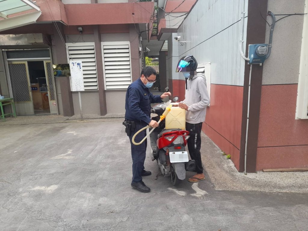 鳳林警分局新社派出所於今(10)日10時40分,一位潘姓民眾徒步到所,向員警表示離派出所往南200公尺處前所騎乘之機車莫名熄火需警協助,副所長張小慶立即陪同到場,經詢問得知潘民因工作關係,騎乘機車從花蓮住家沿台11線要往豐濱村工作,不料途中機車突然熄火,經員警檢視該車無法啟動疑似油料用光,立即協助潘民將該車推回所前空地,副所長以私人備用油料加注該機車後,果然順利啟動機車,潘男萬分感激頻頻向員警道謝後立即騎上機車前往工作地點。
