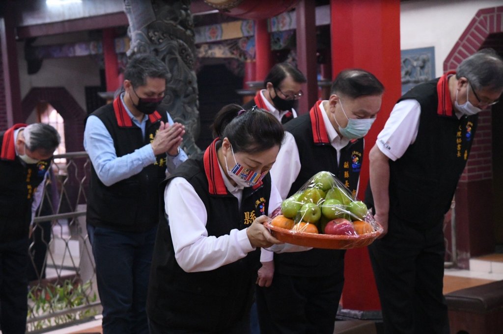 徐縣長與縣議會副議長潘月霞、縣議員陳建忠、黃玲蘭、光復鄉長林清水、瑞穗鄉長陳進光、瑞穗鄉代表會主席陳廖安、富里鄉長陳榮聰、縣府各局處首長及地方仕紳一同遵循古禮參拜祈福,依序敬獻清香、鮮花、素果、財帛等,並以三跪十二叩首禮虔誠禮拜,祈願花蓮風調雨順、合境平安、風雨不侵、物阜民豐、百業興旺。