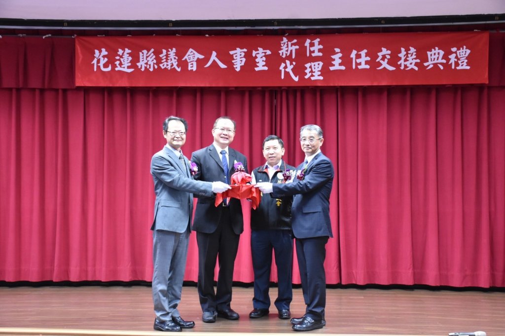 花蓮縣議會14日上午於一樓簡報室舉行人事室新任和代理主任交接典禮,典禮由秘書長陳德惠主持,行政院人事行政總處人事長蘇俊榮擔任監交人,與會貴賓有人事行政總處綜合規劃處長陳素枝、科長謝依霖、花蓮縣政府人事處副處長吳賢惠、國立東華大學副校長朱景鵬、國立台東專科學校校長王俊勝、人事室專員王慧伶等人,笛布斯˙顗賚議員、議會主管與職員及也都到場觀禮,交接儀式簡單而隆重,李主任特別感謝張峻議長的認可和蘇人事長的同意,給他一個回到花蓮服務的機會。