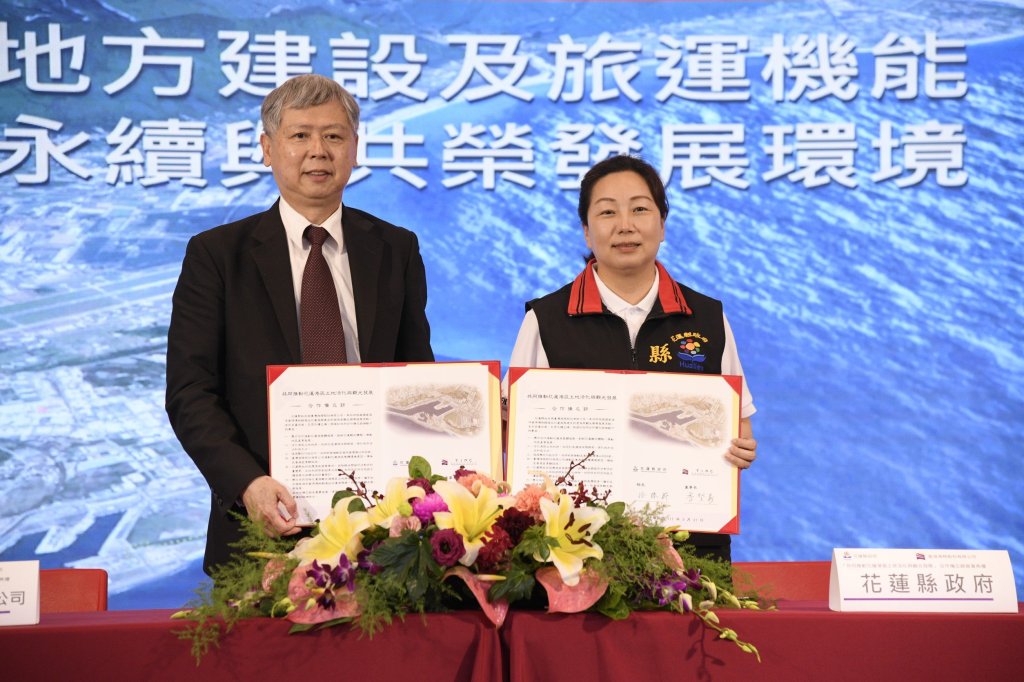 「共同推動花蓮港區土地活化與觀光發展合作備忘錄」簽署典禮於今(21)日下午2時於花蓮縣縣府大禮堂舉行,縣長徐榛蔚與臺灣港務股份有限公司李賢義董事長,傅崐萁委員服務處執行長江東成、行政院東部聯合服務中心副執行長郭應義、海洋委員會主任委員蔡清標及交通部司長何淑萍、航港局副主任李彥明、更生日報社長謝立德、花蓮市公所主任秘書翁美華等相關首長代表均蒞臨觀禮見證這歷史性的一刻。