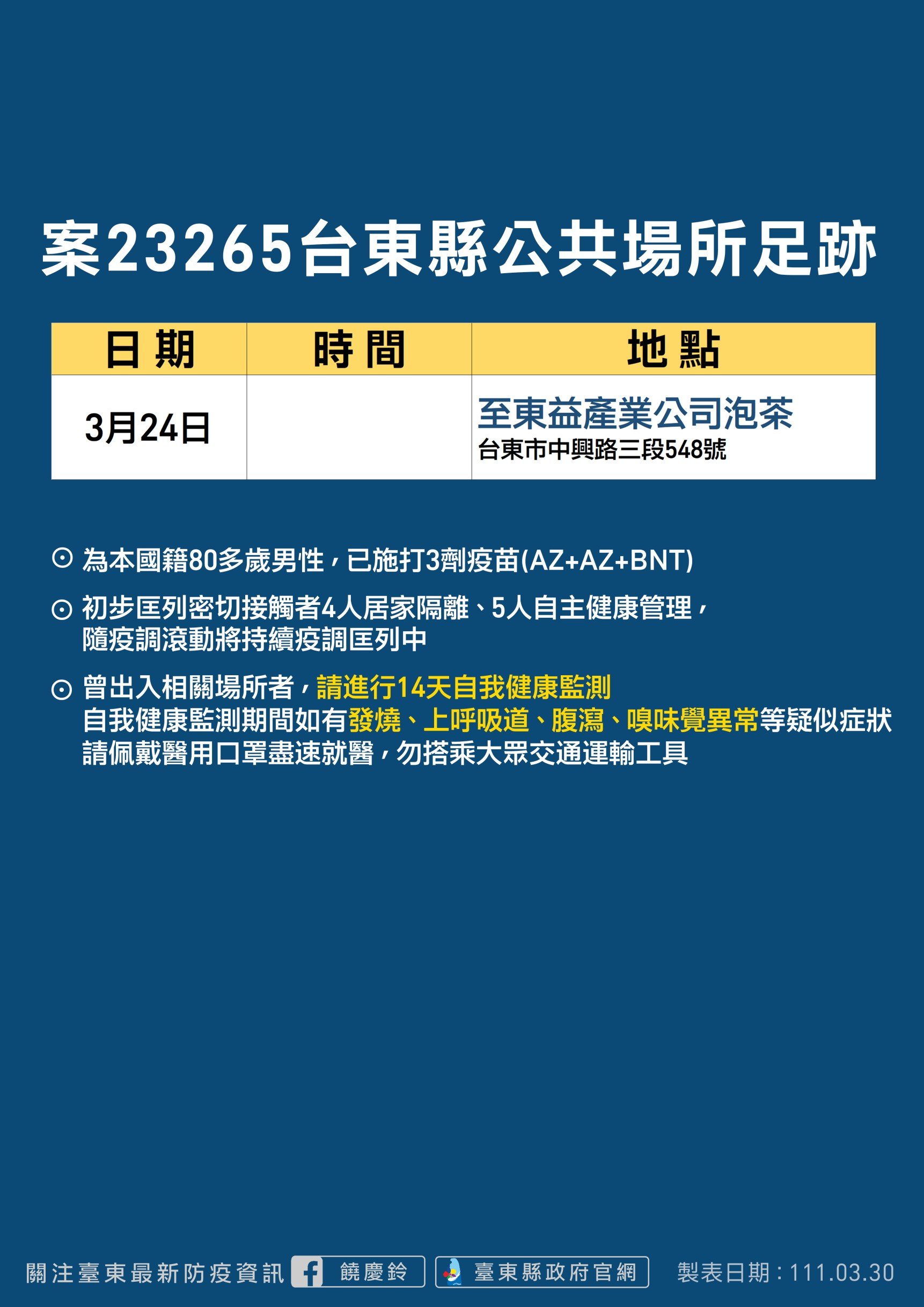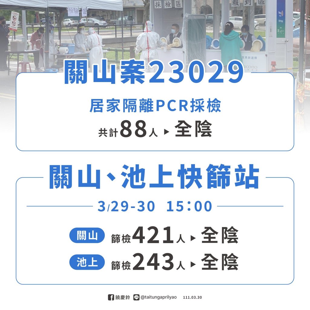 根據今日記者會前最新訊息,今日確診案23264為永安國小家長,她的小孩也確診,永安國小依規定從今日下午起全校停課10天至4/8,縣府明日起將在鹿野鄉公所開設快篩站,早上8:30-10:30為永安國小專屬,民眾可前往篩檢的時間為早上10:30-11:30,下午13:30-17:30;另外,案23082、23125確診母女的家人已被列為居家隔離,這位居家隔離的接觸者為桃源國小幼兒園員工,因此今天下午至明天整天桃源國小也預防停課,全面清消採線上教學。