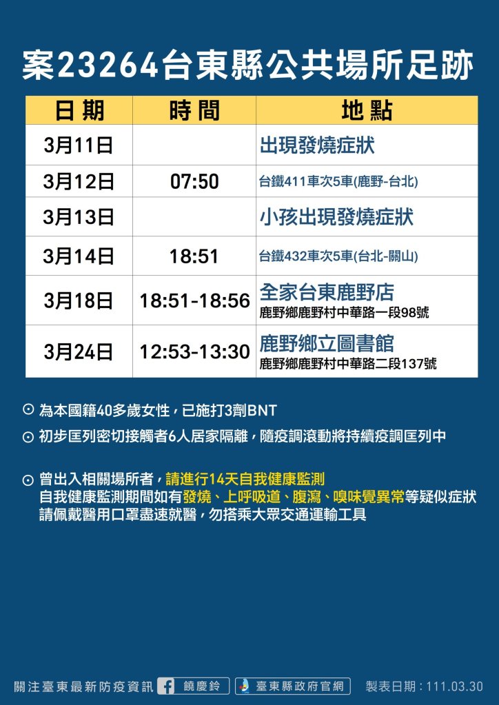 饒慶鈴今日於疫情記者會中表示,今日確診2例包括案23264(40多歲女性),為初鹿牧場員工,根據初步疫調3/11曾發燒,目前無症狀,生活規律多往返住家與工作地,3/12曾搭火車北上回娘家,期間小孩曾發燒就醫,根據初步疫調判斷,目前臺東12例確診中,案23264發病日最早,且娘家與新北中和社區群聚有地緣關係。今日另一案23265(80多歲男性),為昨天公布的案23083密切接觸者,曾一起參加外縣市進香團活動。