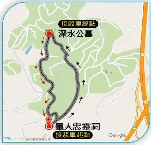 (2) 深水公墓內線:軍人忠靈祠站➡26墓區站(載民眾入墓區) ➡軍人忠靈祠站【墓區內隨招隨停】