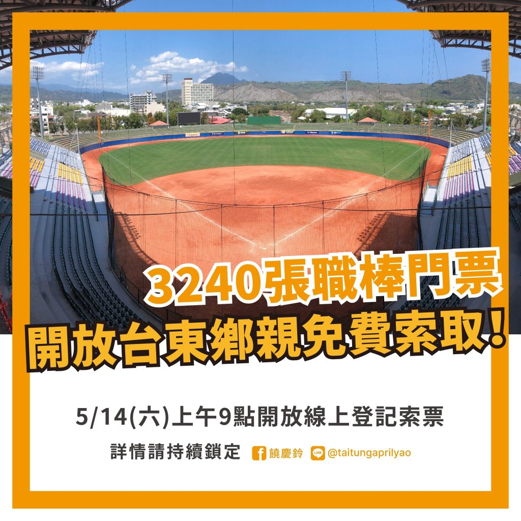 台東鄉親有福了,經台東縣政府積極主動爭取,2022年中華職棒上半年例行賽,中信兄弟5月24、25日安排在台東第一棒球場舉辦2場主場比賽,將與樂天桃猿進行二連戰,球團為感謝縣府長期培育優秀棒球好手與提供優質的比賽場地,讓選手可以在鄉親面前一展球技,也將特別回饋每場2,000張,共4,000張內野票券授權縣府全權分配。縣府教育處表示,除扣除分配縣內25所學校的基層棒球隊師生,包含各國中小、高中職與台東大學等棒球隊教練、校長及1名行政人員及球隊學生共760張,其餘3,240張將分二場次全數回饋台東縣民,並於5月14日上午9點起開放台東縣政府官網及教育處網站「2022中華職棒重返台東索票系統」供鄉親線上登記索取。