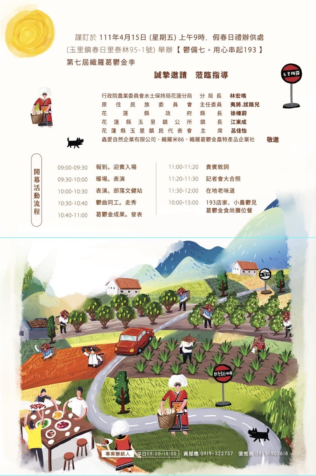 本週五(15日)上午9時,於鎮內春日里春日禮辦供處(玉里鎮春日里泰林95-1號)將舉辦【鬱備七。用心串起193】第七屆織羅葛鬱金季活動。邁入第七年的織羅葛鬱金季,以「自然耕作」為初衷,目的為推動飲食健康,並以食物串連起愛護鄉土之情,希望守護世代最在地的生活方式和價值。