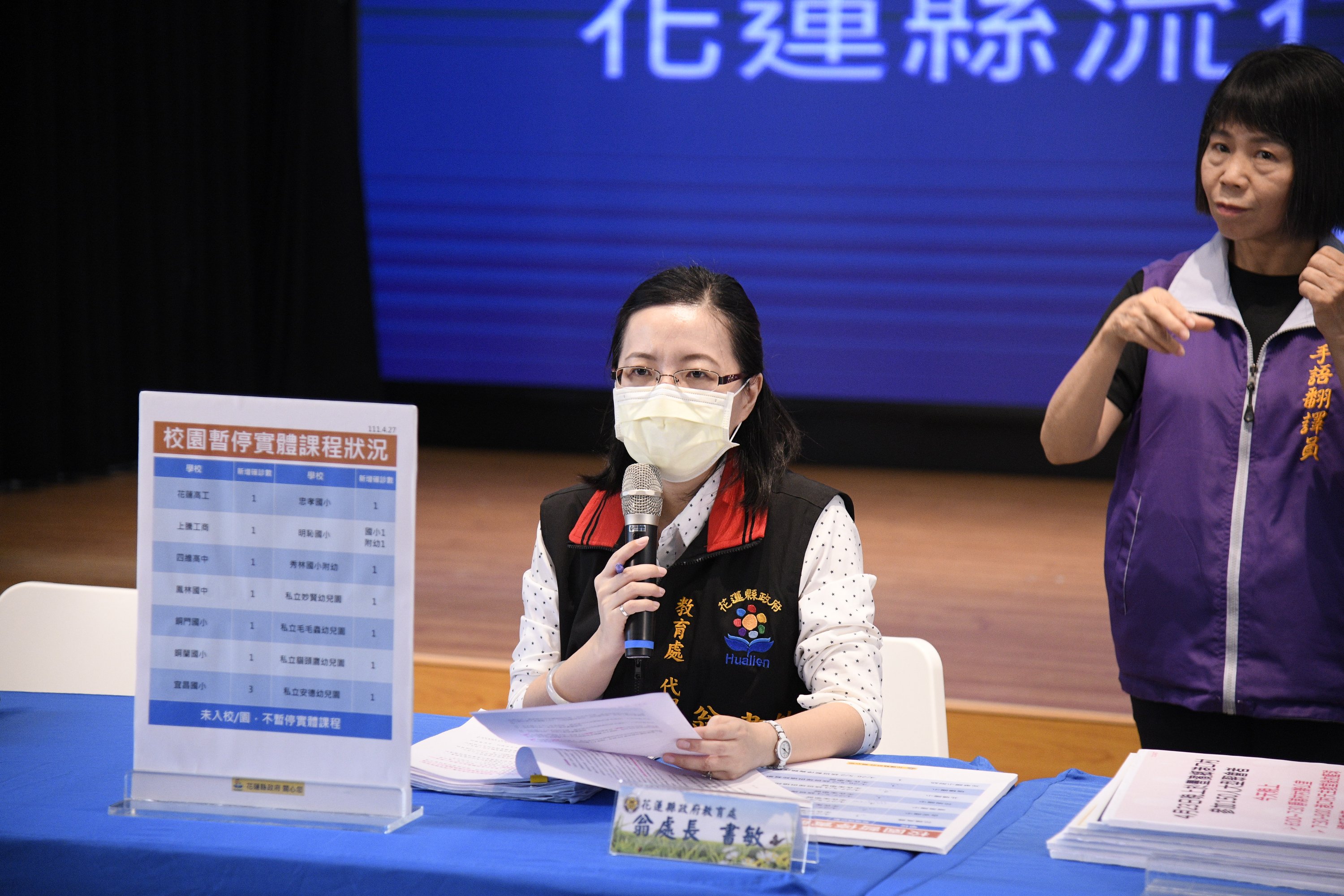 教育處代理處長翁書敏說明今日新增部分校園暫停實體課程狀況,花蓮高農、吉安國中、國風國中、花崗國中、北埔國小、瑞穗國小、光華國小附幼共七所學校,上述學校部分班級將提供遠距教學;另有14所學校共17所學生確診,但因未入校園,不暫停實體課程。