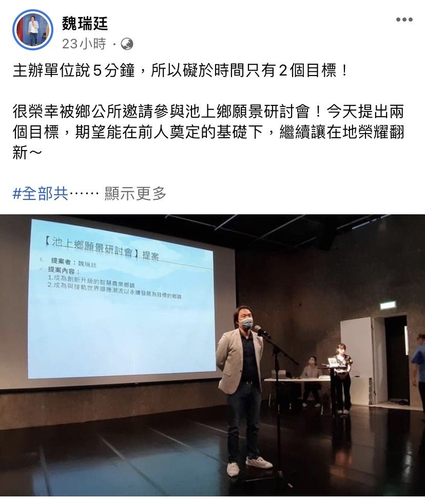 其他無法在研討會中所闡述的願景,魏瑞廷也都將其呈現於社群媒體FB中,盼望未來這些願景能讓池上成為台東最耀眼的鄉鎮。