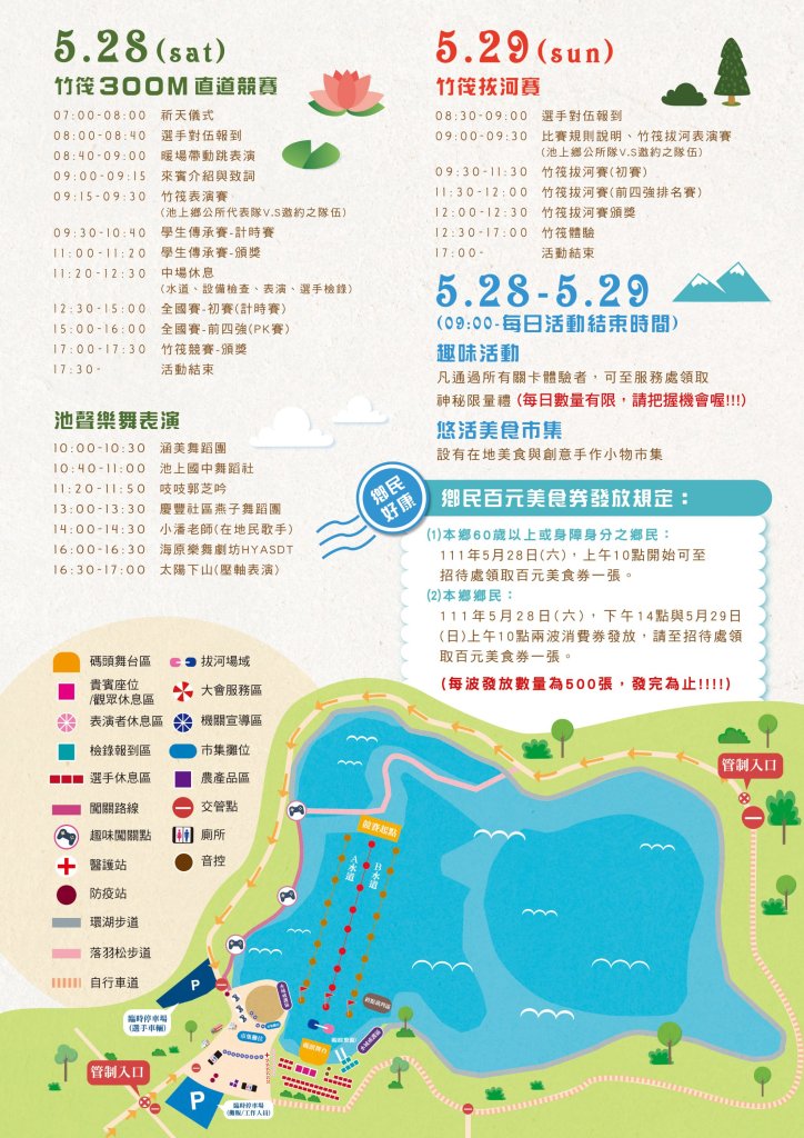 池上鄉公所表示,活動將於111年5月28日(六)至5月29日(日)連續兩天舉行,28日早上將在水上舞台熱鬧開幕,將由池上fanaw文化教育產業發展協會帶動跳作為開場,還有《聲林之王2》榮獲季軍的吱吱郭芝吟、來自花蓮原民舞蹈常勝軍海原樂舞劇坊及壓軸太陽下山樂團接連演出,而緊張刺激的12人制(竹筏300M直道競賽)全國邀請賽將在中午12點半熱血開划,緊接29日上午登場的則是第一屆竹筏拔河賽,將有來自不同縣市的隊伍爭奪第一屆冠軍,下午則是可以使用主辦單位發放的限量竹筏體驗卷,在春意盎然的下午,漫遊在大坡池中,活動兩天皆有發放限量消費卷,不僅有熱血賽事,更有20多攤的特色市集以及闖關活動,歡迎民眾一起來池上大坡池共襄盛舉!