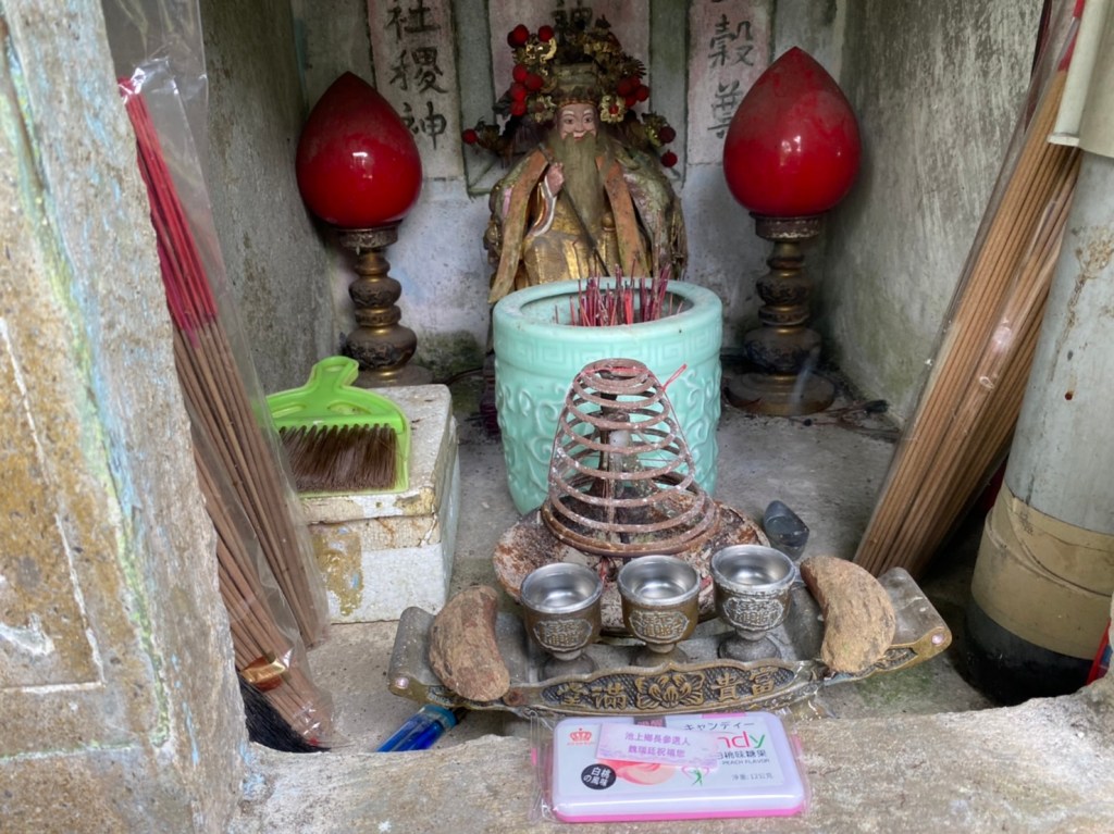 這天,魏瑞廷的拜票行腳來到池上最北端的山區,路過座落在路旁一處迷你的「土地公廟」。可能是當地住民不多平日信眾少,所以小廟旁四週都長起雜草,連廟內土地公像前的香爐、酒杯供架等也顯得有些不潔,連香爐也積水未退。