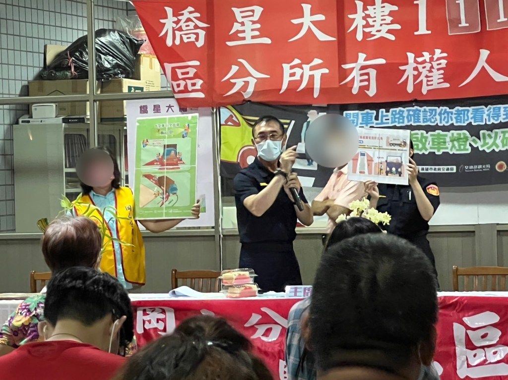 橋頭所長丁木宏、警員林聿芸、陳柔蓁3員,針對本轄的交通安全,尤其橋頭區省道筆直且為大型車必經之路,近期因社區開發迅速,新大樓、中型百貨公司「岡山秀泰樂GO廣場」及「高雄醫學大學附設高醫岡山醫院」紛紛在此在此進駐營運,再加上原有的數間鋼鐵工廠,大型車行經此處只增不減,所長特別向住戶們提醒「內輪差」,要求民眾勿騎乘在大型車側面,以避免不小心進入轉彎死角,造成生命的損傷。此外,警方也向民眾介紹新型反詐騙的手法,包含「投資型詐騙」、「色情交友詐騙」以及近年又重新崛起的「猜猜我是誰」等詐騙型態,叮嚀民眾切勿以貪小便宜的心態輕信不認識的人談投資與會要錢的假檢警,並舉例實例分享,讓住戶們不再感到擔心受怕,自己也能辨別詐騙手法。