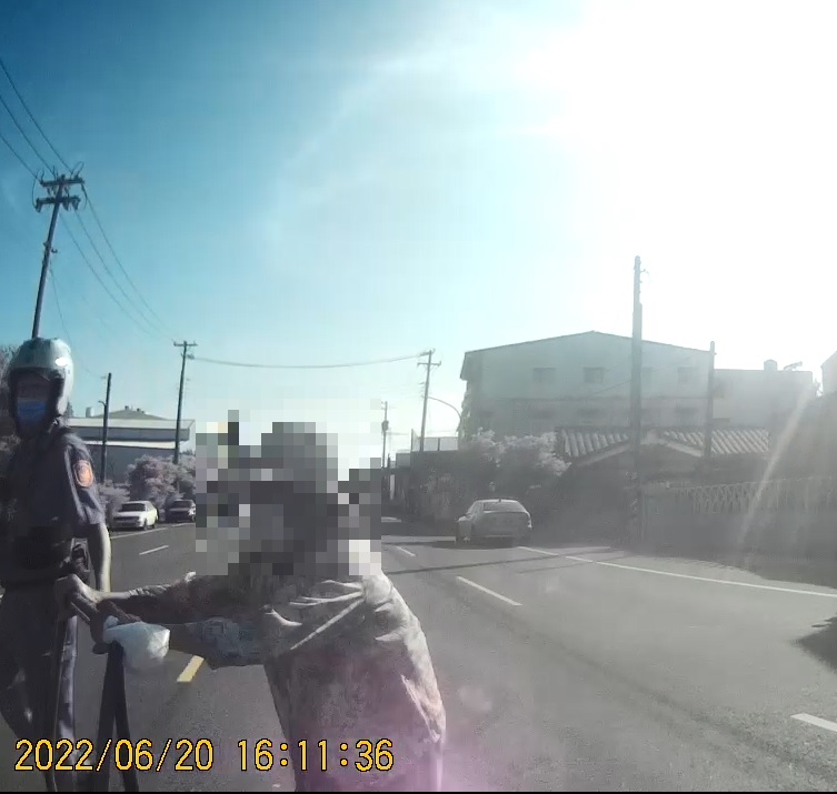岡山分局梓官分駐所於6月23日下午16時許,接獲民眾報案表示於梓官區信義路與信興一路口附近有人路倒,請求警方協助。經巡邏警力巡佐羅清暘、警員唐政民趕赴現場,發現王姓阿嬤高齡88歲,疑似因為年紀大,雙腳較為無力,平時需要依靠輔助器行走,因突然想購買拜拜用的香,便推著手推車當輔助器,獨自走到距離自家將近700公尺遠的商店,回程途中,疑似體力耗盡,雙腳癱軟,才會跌倒在大馬路邊。