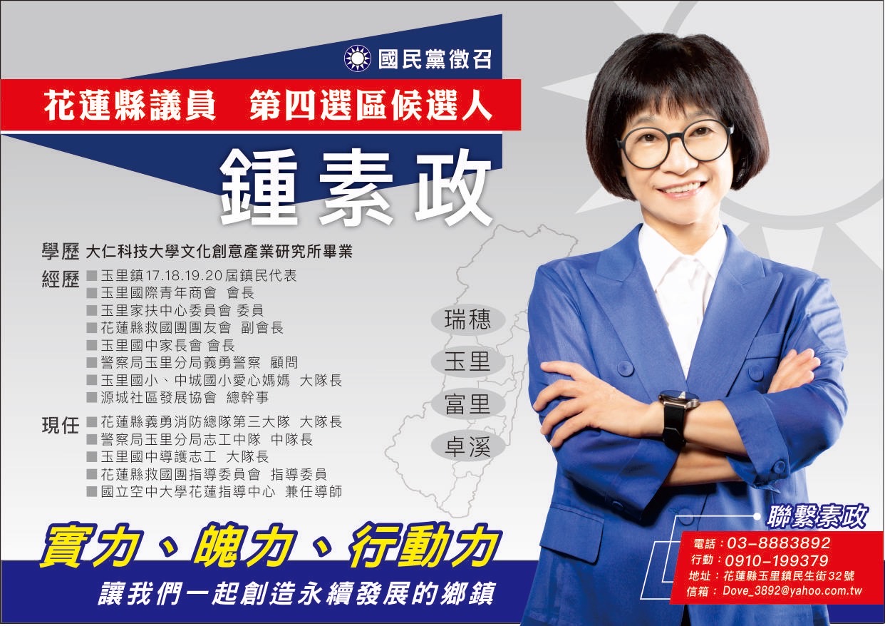 鍾素政表示,天災地變的這些日子以來,看著跑遍大街小巷穿梭災害地區家庭的徐榛蔚縣長及有關單位的配合勘探重建計劃,很感動縣長超強的行動力,處處溫情送水及物資到受災社區及家庭的慈善機構及熱心人士、慈濟的志工團隊,我們感謝更珍惜,希望重建工作順利完成,讓我們都能恢復正常生活秩序,祝大家平安順心。
