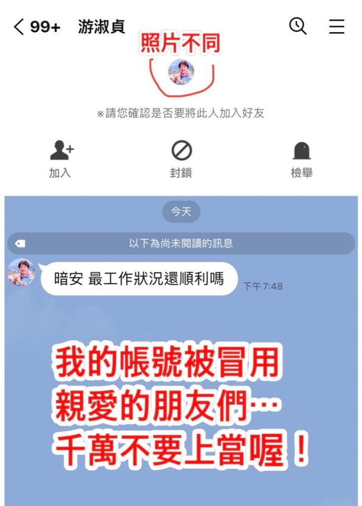 一句暖心的問候背後竟暗藏詐騙玄機,冒用者運用游淑貞公開網站取得其照片,再以Line開設假帳號,向民眾貼心問候「最近工作狀況還順利嗎?」、「晚安」等訊息,游淑貞指出,幸好有不少民眾機警察覺游淑貞怎更新帳號?游鄉長的Line帳號頭像換了?與鄉長平時慣用不同?連問候的語氣更與以往大相逕庭,才不致受騙上當,但她也強調,目前尚未得知詐騙集團行騙的規模擴及多少群眾,只能先行轉發消息提醒民眾切勿輕信,同時也將前往警局備案,期盼早日將不法分子繩之以法。