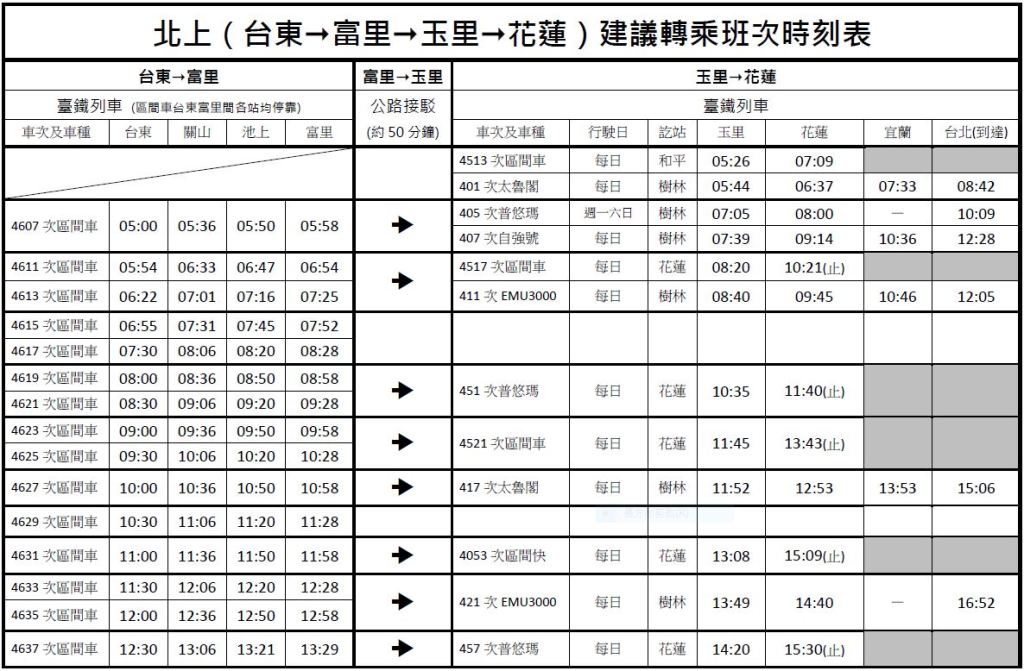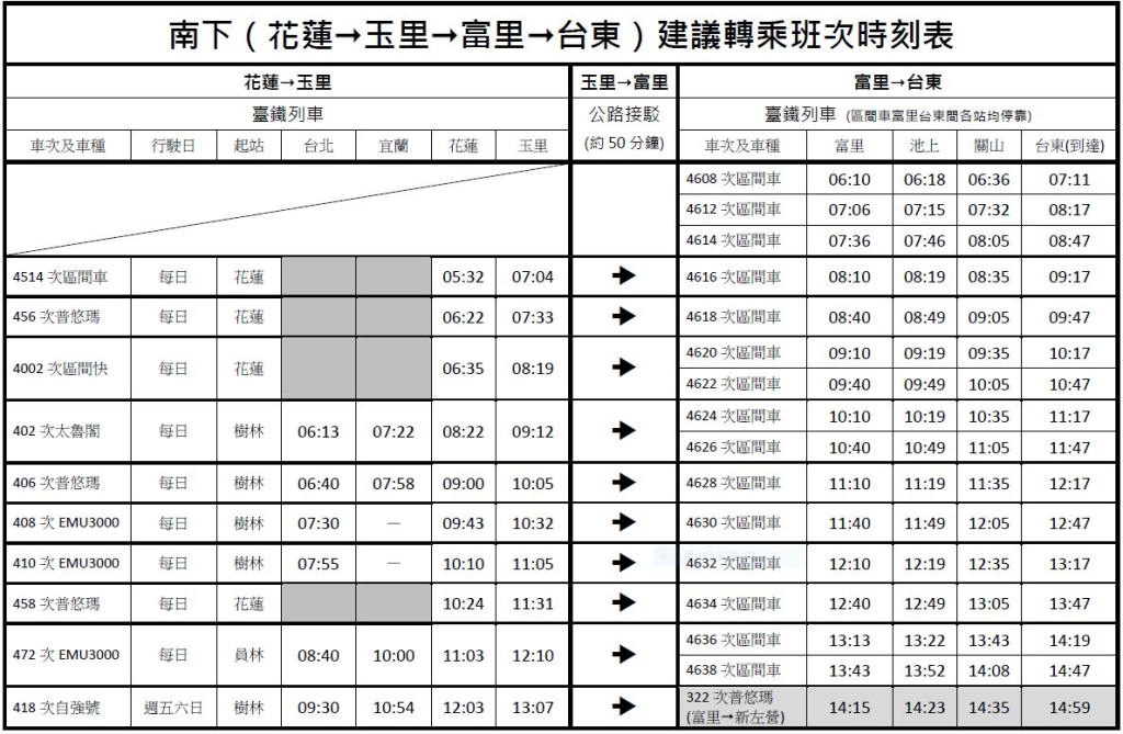 玉里-富里間仍以公路接駁方式辦理,接駁車班次依火車行駛時刻開行,平均候車時間在15分鐘以內,原花蓮=玉里=臺東間類火車公路接駁不再辦理。公路接駁辦理時間:玉里→富里:每日6:30~22:00、 富里→玉里:每日6:00~22:10。