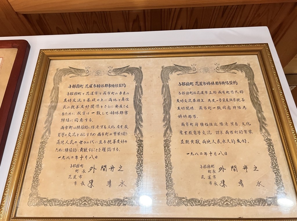 歷史館內除了有珍貴的與那國島圖書資料之外,還有台灣、日本和與那國町的大事紀,以及花蓮市締盟姊妹市的完整資料。魏嘉賢說,館內保留四十年的紀錄,包括前縣長陳清水當時以市長身分到與那國町和當時的町長外間守之簽署締盟的照片,以及不少花蓮地方重要人士一同前往的畫面,另外還有各周年慶的活動紀錄,看到四十年的資料能夠保存得這麼完整,真的令人很感動。魏嘉賢表示,花蓮和與那國町有著密不可分的關係,希望未來在文化、教育與經濟方面有更多的互動,促進兩地共存共榮。
