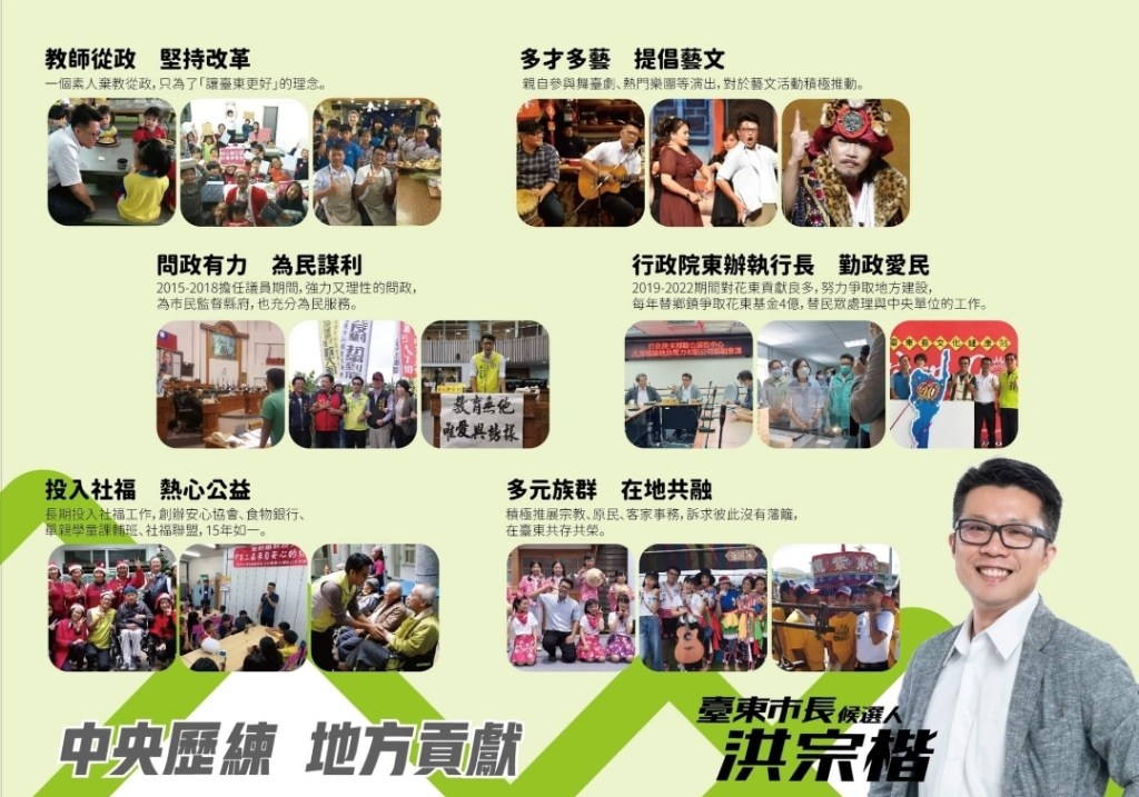 洪宗楷的競選總部主委由前立委也是前台東市長的賴坤成擔任,賴坤成8年前第3度競選台東市長,敗給國民黨張國洲,這次,他力助洪宗楷,要將人民有感的施政方針傳承再進化,期盼能夠在長期藍大於綠的台東成功翻轉。
