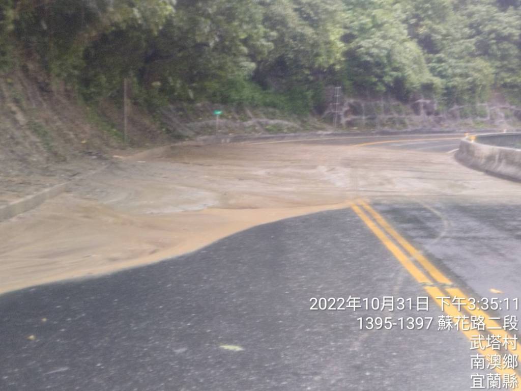 中央氣象局持續針對宜蘭縣發布超大豪雨警報,這兩日蘇花路廊雨勢不斷,同樣於上午十時許,位在台9丁線45.9公里處也發生邊坡坍塌阻斷道路,多處路段泥流情形,南澳工務段緊急封閉蘇花公路全線道路,在工務段及契約廠商兵分多路搶修下,於下午2:30解除全線封閉開放通行。