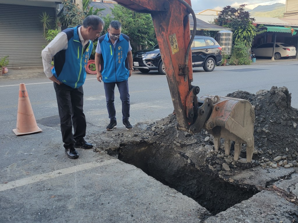 江鎮長正在視察一處因地震導致路面龜裂的地方,江鎮長表示位在博愛路鎮民廣場旁的道路地震後已經有補強重鋪,可是卻又發現持續有塌陷的跡象,前日找來怪手開挖才發現,位在路面下的箱涵已破裂,今日趁雨停公忙之餘來現場察看,回去將討論後續處理方式。