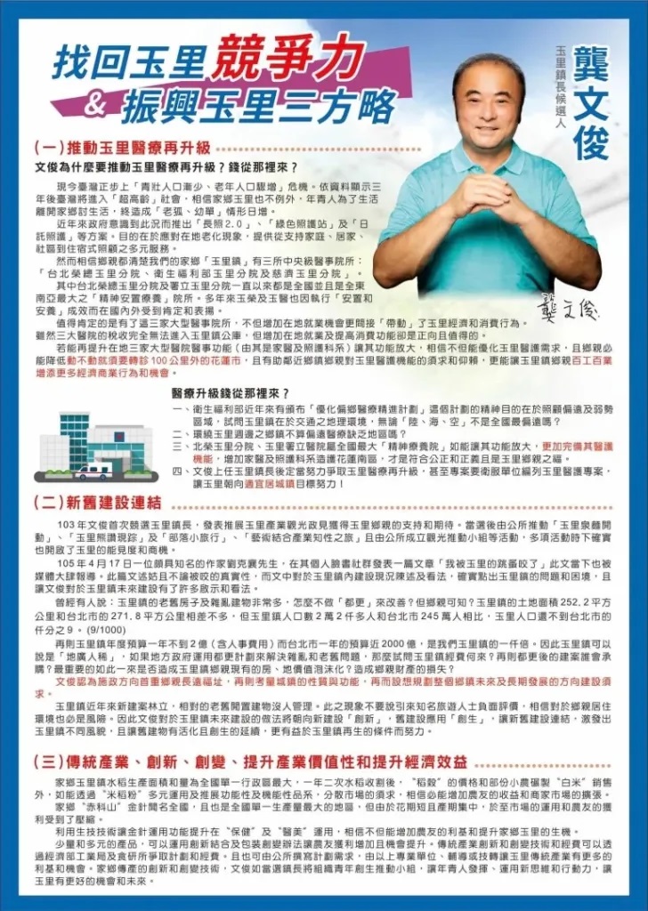 花蓮縣玉里鎮是南區重鎮,不論是經濟、交通或是產業,早期可說是南區四鄉鎮之首,然而近年諸多因素使得玉里鎮不進則退的落居在後,鎮長參選人龔文俊就提出了看法,在當選之後要去擘畫執行的方向。