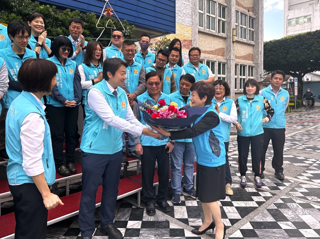 這場「畢業照」合影今天上午在市公所前廣場舉辦,里長及公所團隊在主任秘書翁美華帶領下,均穿上公務藍色背心,分兩梯次拍照,公所同仁特地準備了一束鮮花,由蘇主席送給魏市長,表達祝福之意。