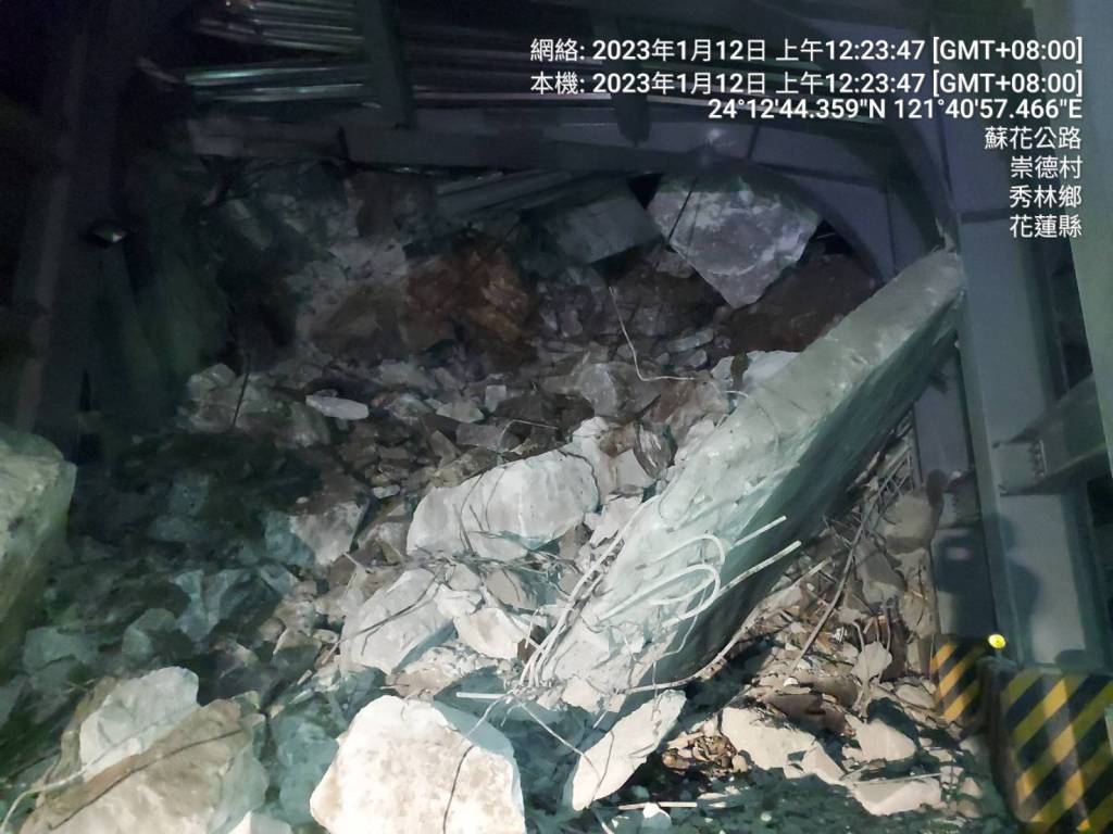 今(12)日零時許(確定時間為11日晚間23:55分),位於台9線蘇花公路大清水路段159.2公里處的隧道內發生落石坍塌,由於面積不小將隧道完全堵住,造成雙向車輛皆無法通行。