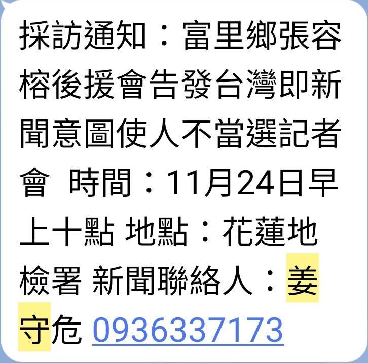 去(111)年花蓮縣富里鄉長選舉期間,台灣即新聞電子媒體報導候選人張容榕已經退選,張容榕後援會仍自行印製文宣散發一事,遭後援會人士提告「意圖使人不當選」涉嫌違反選罷法,台灣花蓮地方檢察署檢察官認為難以認定此篇新聞報導不實,而作出不起訴處分。被告的楊金明記者(時任花蓮縣東台灣記者協會理事長)不滿名譽、媒體商譽受損,將提告張容榕後援會等人。