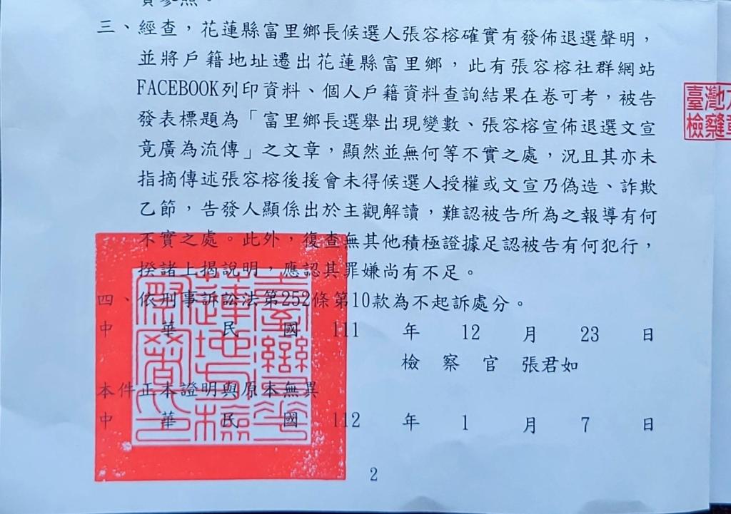 楊金明理事長表示,近日收到地檢署不起訴處分書,內容指出張容榕確實發布退選聲明,並將戶籍遷出富里鄉,他以「富里鄉長選舉出現變數、張容榕宣布退選文宣竟廣為流傳」為標題發表的文章,內容皆向張容榕本人查證,並沒有不實之處;檢察官亦說明,報導內容並沒有指摘傳述張容榕後援會未得候選人授權或文宣乃偽造、詐欺,告訴人是出於主觀解讀,難認報導有何不實之處。
