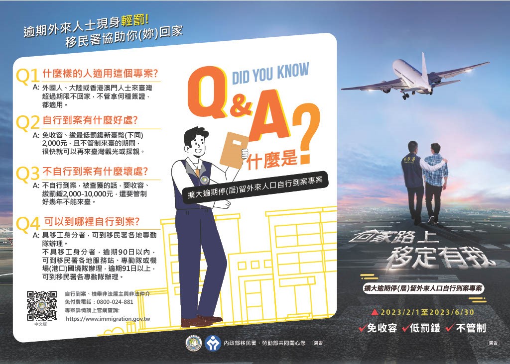 為協助因疫情而滯留在臺之逾期外來人口儘速返國,並鼓勵在臺失聯外來人口出面自行到案,移民署近日推動「擴大逾期停(居)留外來人口自行到案專案」,協助逾期停(居)留外來人口平安返回母國。實施期間自112年2月1日起至6月30日止,為期5個月,在臺逾期的外來人口未被執法機關查獲前,未有限制出境或禁制出國等情事,免予收容、繳最低罰鍰新臺幣2千元,不管制,適用對象包括外國人、臺灣地區無戶籍國民、大陸地區人民及香港澳門居民等外來人口。