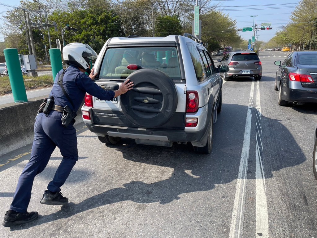 深水派出所副所長郭敏碩、警員曹庭勗等2員巡邏見狀,立即在拋錨車輛後方警戒及疏導交通;因該路口位於國道10號燕巢交流道下,車流量較大,避免發生追撞事故,員警為排除緊急狀況,立即協力將車輛推至路旁安全處,再請杜男聯繫道路救援幫忙。