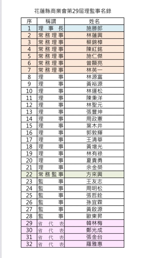 花蓮縣商業總會昨27日於芳村餐廳舉行第二十九屆第一次會員代表大會同時進行理監事選舉議程,台灣省商業總會監事會召集人同時也是國策顧問鄭錦洲專程來到花蓮,表達各縣市商總力挺花蓮商總理事長施勝郎參選台灣省商業總會理事長,縣議員韓林梅、鄭寶秀也專程到場為施勝郎加油打氣,縣府社會處行政科科長黃姿華、科員張文鏵、社工師柯景宣也全程列席大會。