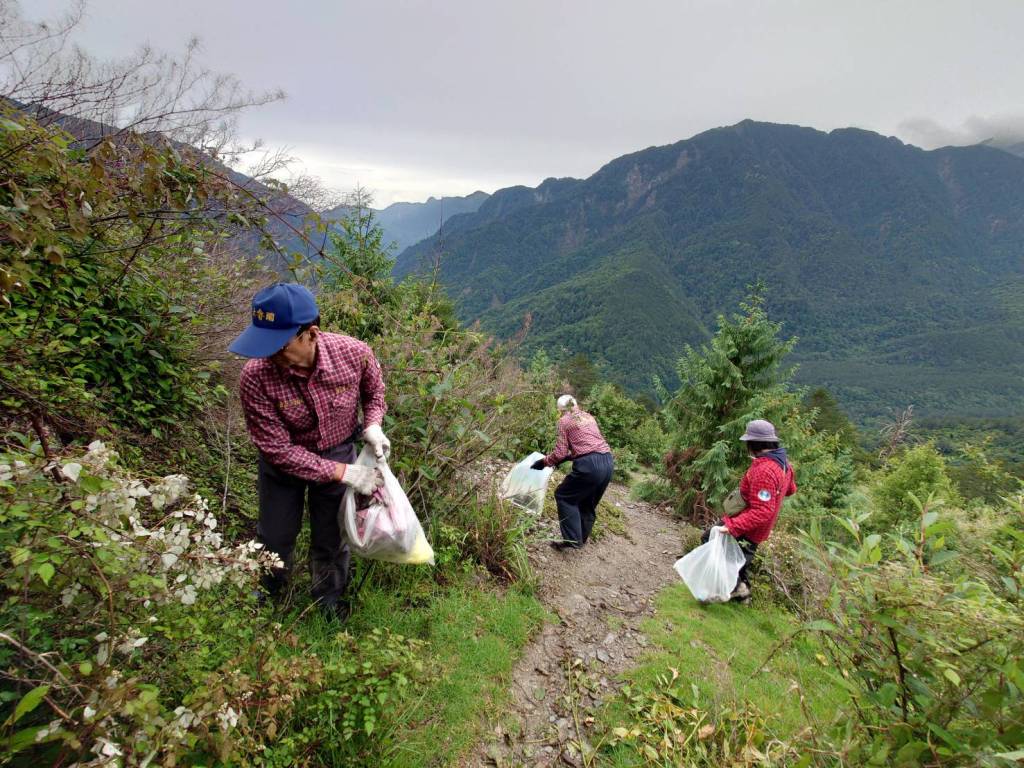 17日一早來自各單位的員工、志工們,分組前往昆陽、武嶺、合歡山遊客服務中心、小風口、畢祿山登山口、石門山、小奇萊等地進行淨山活動。參與淨山的伙伴不畏山風凜冽、山徑崎嶇,帶著好心情努力清理垃圾,不時從帶刺的高山薔薇叢中挖出飲料罐或追著被風吹跑的塑膠袋或將停車場上的煙蒂、果皮、衛生紙一一撿拾出來,最後總共清理出40多包約85公斤重的垃圾。