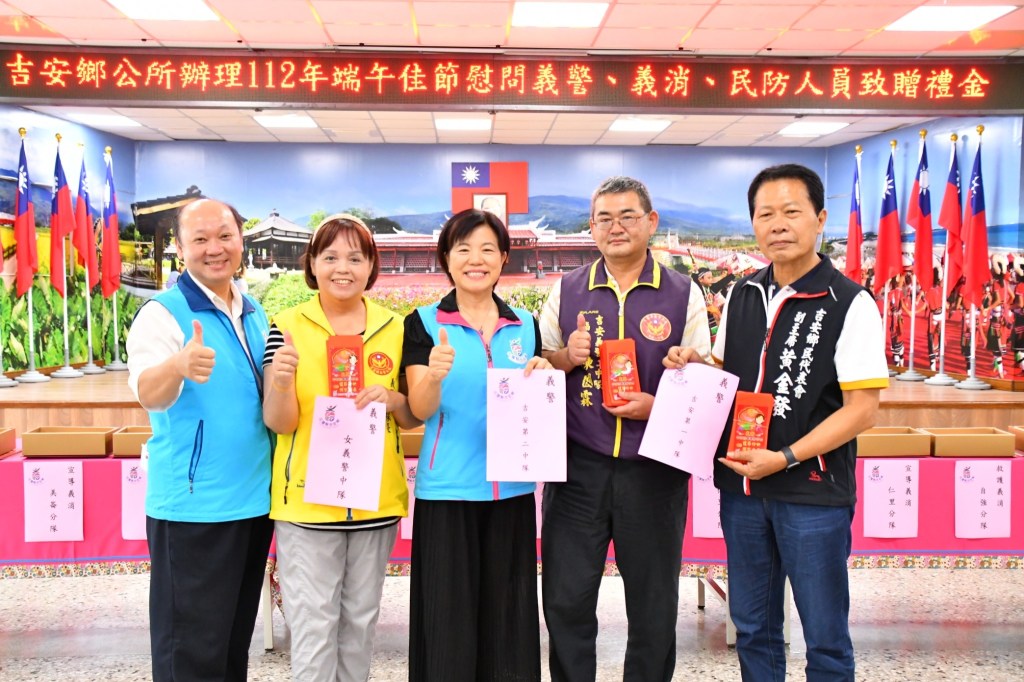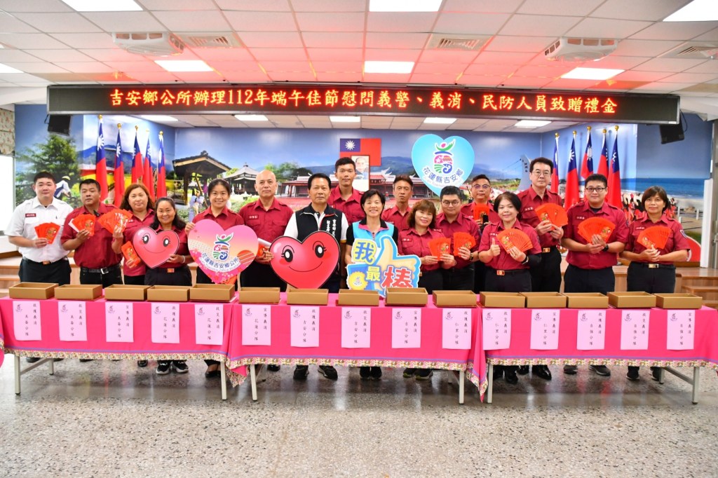 吉安鄉公所為感謝協勤民力共啟社會服務,在公部門人力有限,民力無窮的互助協力下…創意無限的圓滿施政服務。有鑑於協勤志工們長期犧牲個人休憩時間,無私在吉安鄉境內值勤分工服務,特於端午節前夕,由鄉長游淑貞親頒贈112年吉安鄉端午節禮金,感謝義警、義消、民防、巡守協勤民力人員各司其職攜手達標任務,為社會帶來安全防護、分擔社會祥和服務工作,包括義警175名、民防64名、義消290名、巡守隊402名,總數額為931位協勤員額,由民防大隊長夏貴勇及民防各分隊長、義警吉安女子中隊長呂玉英、吉安義警一中副中隊長黃金發、吉安義警二中隊幹事及義消、救護、防宣分隊長們代表領取,大家皆為義務無給職,滿腔熱忱共構平安幸福。