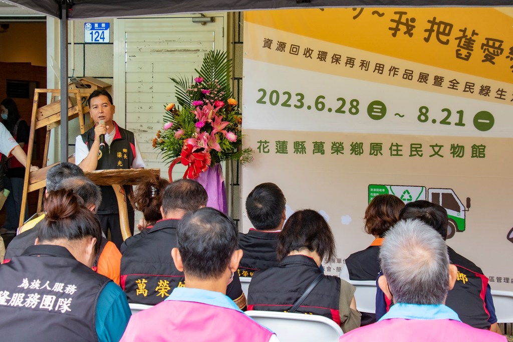 萬榮鄉公所與花蓮縣環境保護局共同辦理的「親愛的~我把舊愛變新歡了」-資源回收環保再利用作品展暨全民綠生活宣傳活動,今(28)起於萬榮鄉原住民文物館展出,展期至112年8月21日(一)止,展出作品的主要材料大多數來自於清潔隊同仁從家戶回收的大型家具、廢家電、廢輪胎、玻璃或寶特瓶、塑膠罐、紙箱、舊衣回收..等、颱風過後協助清運的路樹、林務局萬榮工作站整修宿舍的汰舊木材、台電提供的廢電纜木軸、經花蓮縣政府媒合取得的淘汰課桌椅,甚至本鄉辦理射耳祭鋸木頭比賽用過廢木料,這些在別人眼裡不起眼的垃圾、廢材,對我們來說都像是如獲珍寶似的被保留下來。