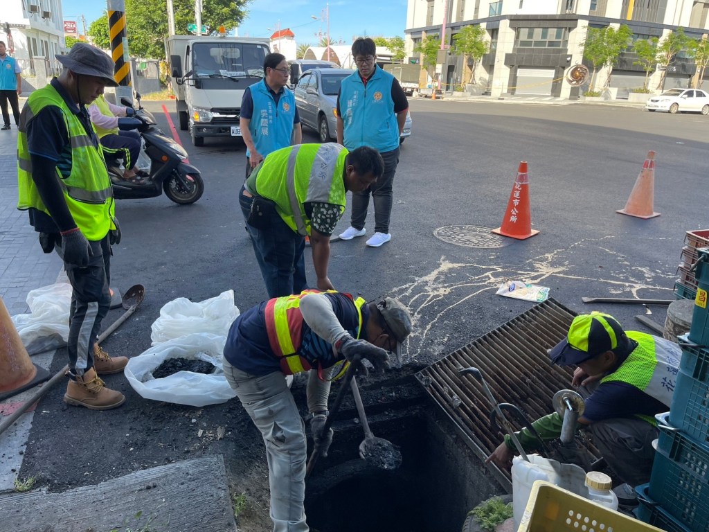 市長魏嘉彥下午在清潔隊長吳慶展的陪同下,前往關切清溝作業,他表示,花蓮市清潔隊除了平日例行性的清淤作業,特地在颱風來臨前,再次安排針對低窪地區加強排水溝清疏作業,今日已完成重慶路與明義街口、華廈街51-93號、球崙二路232號至華廈街86號等處,確保各地區排水設施機能順暢無礙。