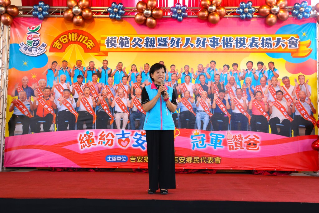 游淑貞表示,每位父親來自百工百業,創造自我生命故事,集身教言教成為各界的楷模典範,為家庭社會付出的行動力,更是家中強壯靠山。另外好人好事代表,多是愛心服務激勵社會良善循環,用身體力行的雙手完成每一份鄰巷細微貼心服務,共展吉安千萬雄兵之社會能量。藉隆重典禮致上吉安鄉滿滿感謝心意,並喚起社會盡孝、盡善循環延展。