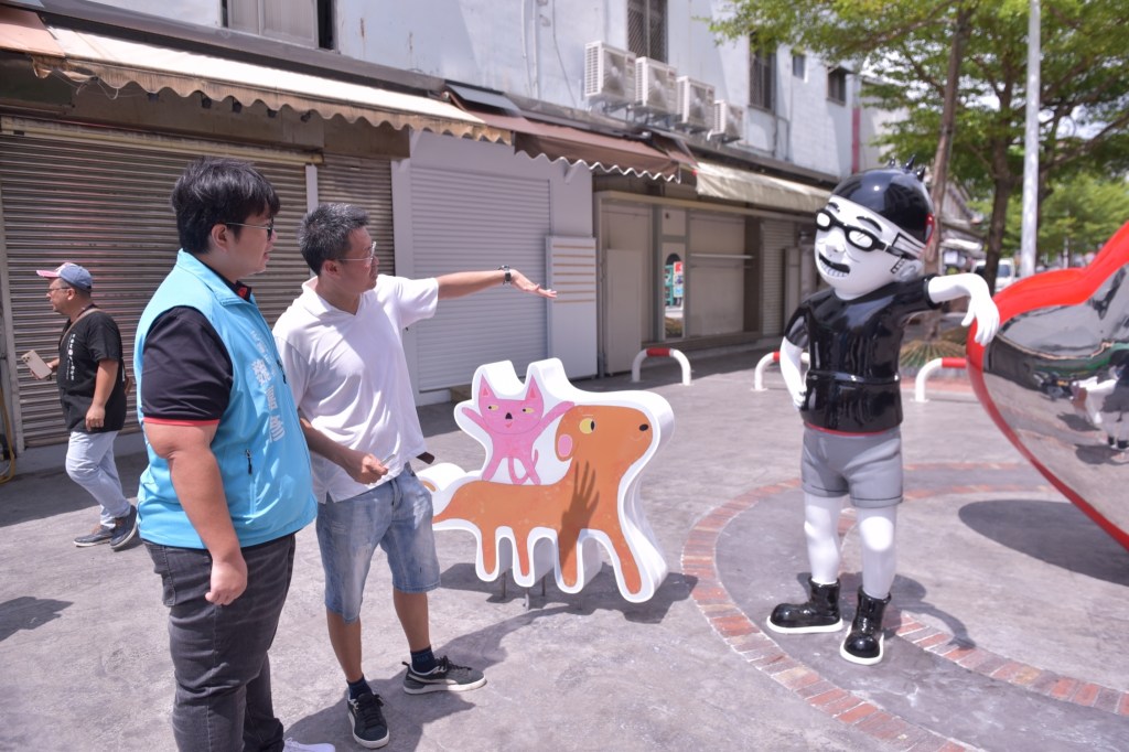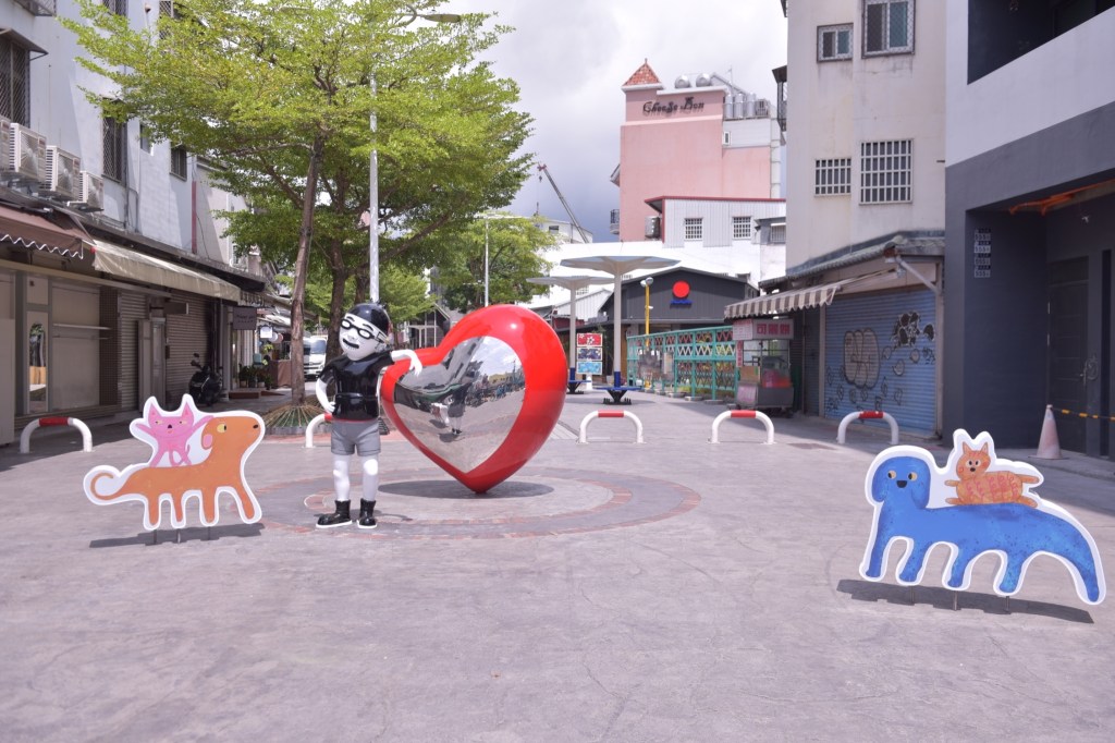 黃裕榮表示,欣「心」向榮這件作品的設計理念與創意構想,在考量上不僅要與當肯公仔相互呼應,也希望將主角聚焦於民眾身上,因此透過具有充氣感的愛心立體裝置,中間區域以不鏽鋼鏡面映射周遭人群及環境,象徵一切都被愛所包覆,此外,也特別安排與孩子的共同創作,以貓狗當家的童趣插畫表現手法進行點綴,期待為商圈帶來欣欣向榮的前景。