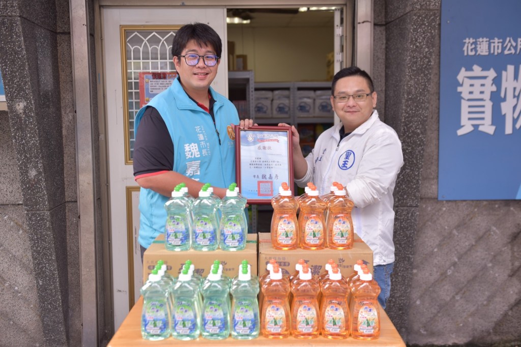 坐落於和平路的聖王堂延續行善腳步,日前再度向花蓮市實物銀行捐贈一批洗碗清潔用品,市長魏嘉彥專程到場接受這份愛心,他也代表弱勢朋友向堂主黃禾丞致上感謝,並頒贈感謝狀。