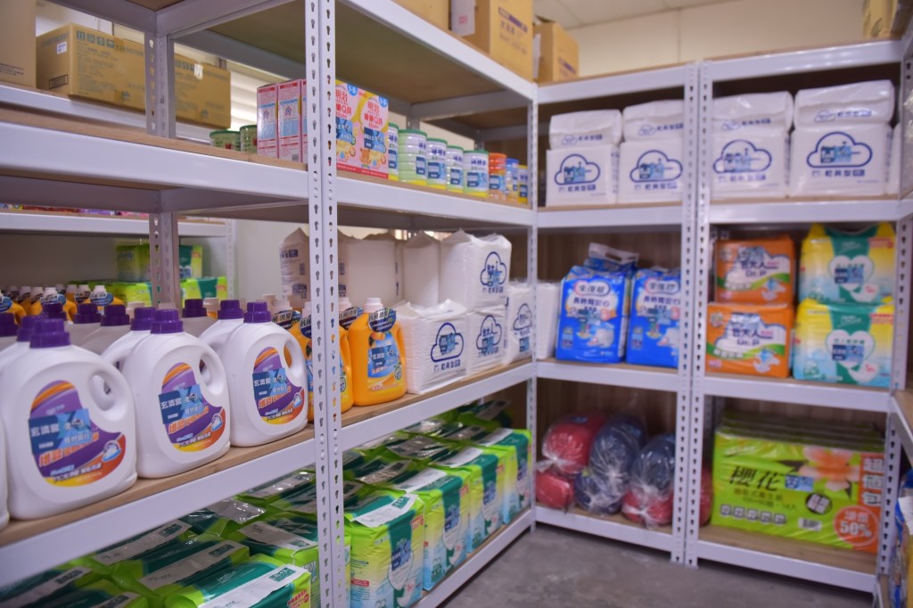 一瓶瓶的洗碗精擺放上架,在實物銀行提供民眾前來申領。黃禾丞表示,本次捐贈由來自桃園市經營東海岸釣蝦場的友人所發起,經向市公所了解目前較為短缺的品項後,將善款全數化作物資,期望透過點滴善舉幫助更多需要的群眾。