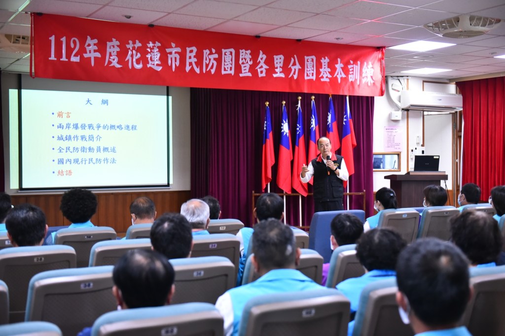課程首先邀請到曾任軍職退伍的縣府民政處張家福講師,對於民防法及相關子法進行闡述,並以反恐為主題,向民防團員進行全民國防教育;接著由花蓮縣消防局花蓮分隊教官吳弘翊說明火場逃生必備的救援及避難守則,建立防災、救災、減災的概念,增加民防團員協助救援的量能。