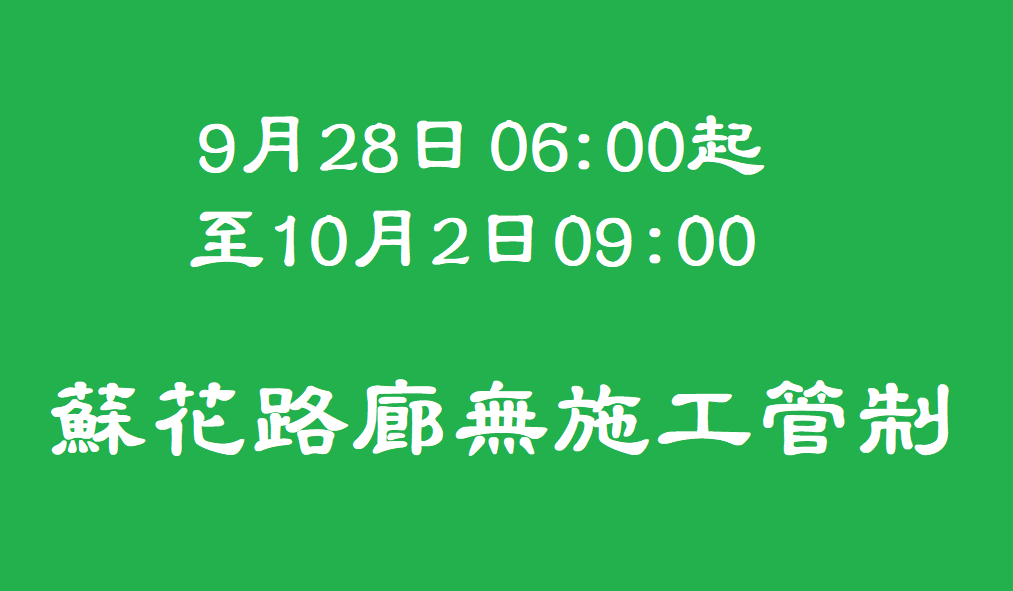 自9月28日凌晨6時起,取消所有工區施工管制至10月2日上午9時。