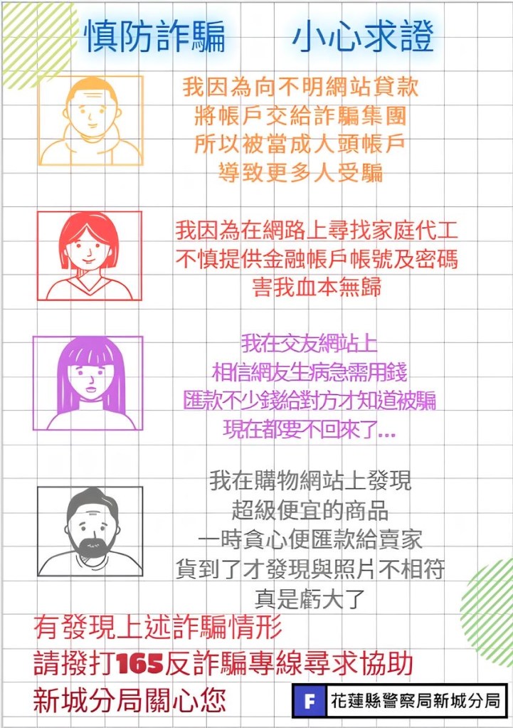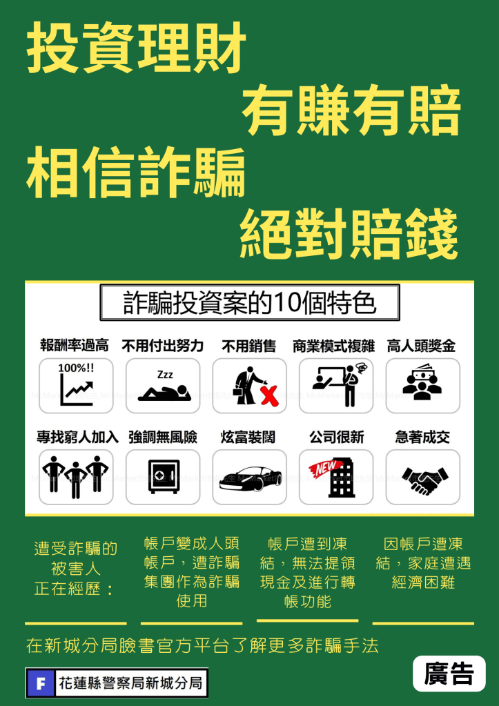 新城警分局呼籲,如遇有疑似詐騙之情事,應提高警覺、冷靜思考,並加以查證,若有疑問可撥165防詐騙諮詢專線或110報案通知轄區警方到場協助,避免辛苦的血汗錢遭詐騙集團騙取;警方也將持續前往轄區學校、社區或活動場合,加強宣導,強化民眾自我保護意識。
